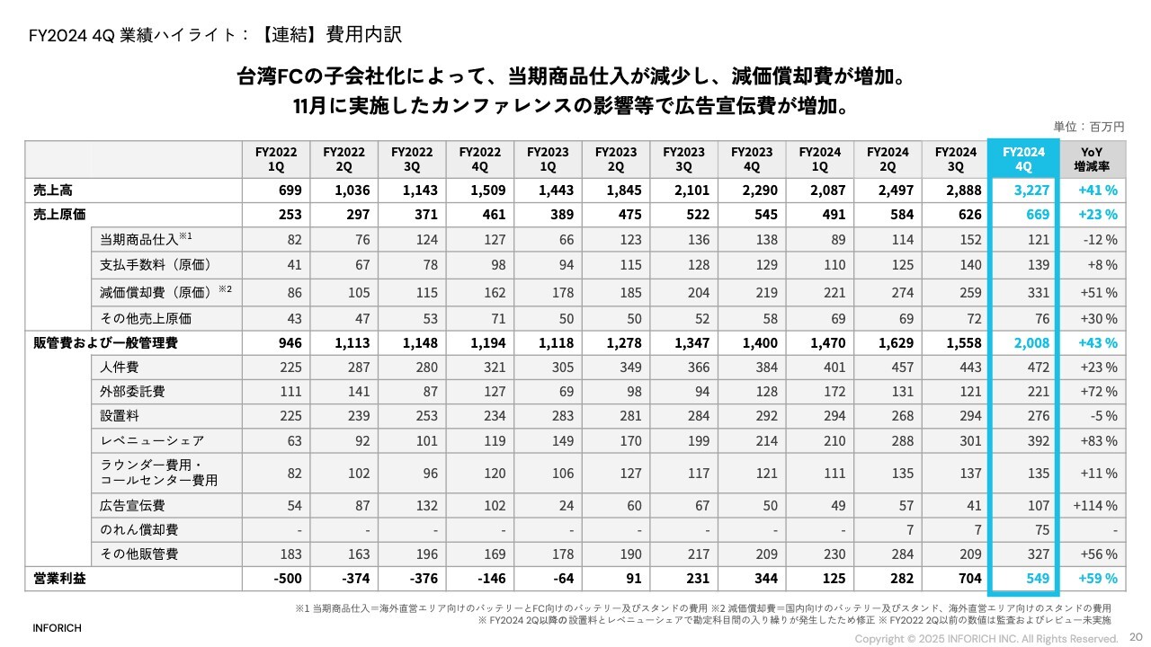 橋本:2025年については、変動費は売上に連動して当然増えます。一部はこれまでも四半期ごとにご説明してきたとおり、業者の切り替えによる支払い手数料の単価の削減や、減価償却費にケーブルの品質向上などを含めていきます。今までのエコノミクスより、少し良くなる可能性があると考えています。