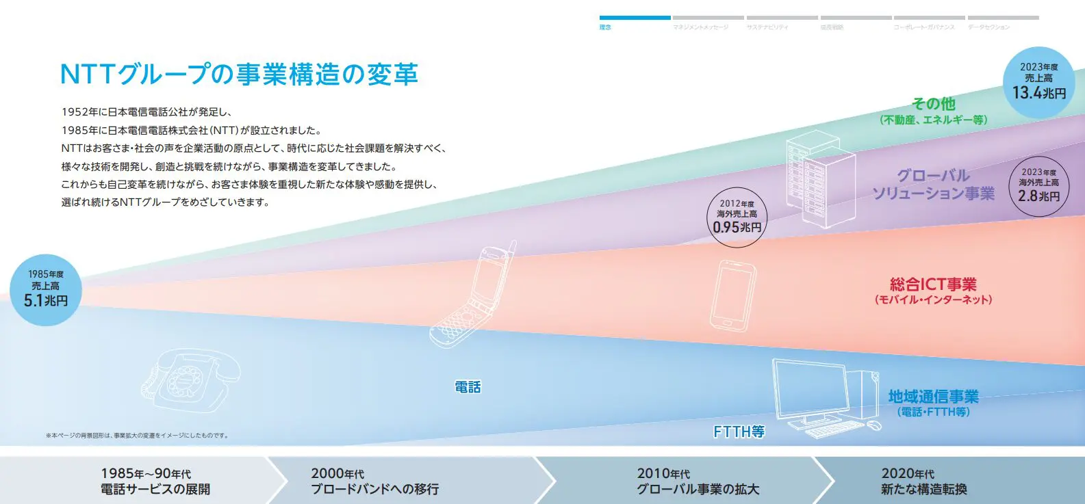 NTTは元々電話会社で、1985年に民営化したときの売上高5.1兆円の大部分は電話事業によるものでした。