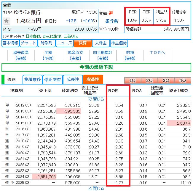 PERは13.4倍と、利益の少ない銀行としてはやや高めの数字です。