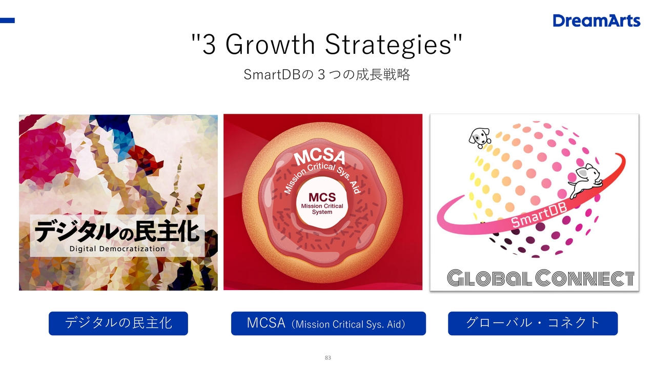 3番目に、日本の大企業の海外DXを強力に支援することを目的に「Global Connect」構想を発表しました。我々は「デジタルの民主化」「MCSA(ミッションクリティカルシステムエイド)」「Global Connect」の3つを重要戦略と位置づけています。その3つ目の戦略として、日本の会社の海外オペレーションに「SmartDB」を活用いただくことにさらに力を入れていきます。