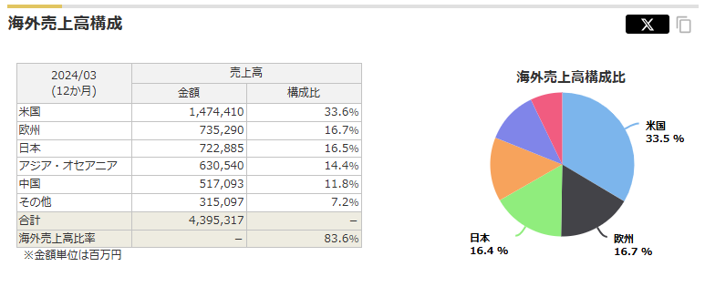 海外での売上が全体の83%を占め、主な市場はアメリカ、ヨーロッパ、日本の順となっています。