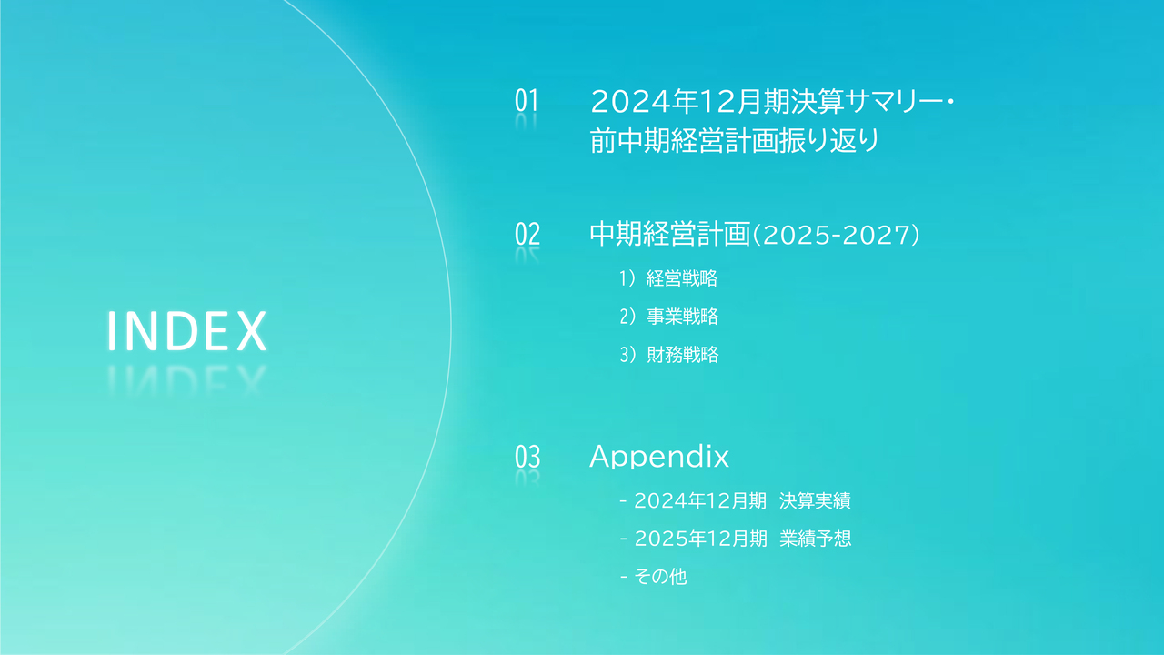 こちらは本日のアジェンダです。新しい中期経営計画についてお話しする前に、まずは簡単にサマリーとして、2024年12月期の実績および前回中期経営計画の振り返りをご報告します。