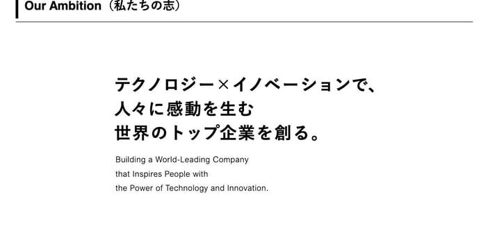 我々が目指している姿です。「テクノロジー×イノベーションで、人々に感動を生む世界のトップ企業を創る。」の志を掲げ、創業から今日まで変わらず行っています。
