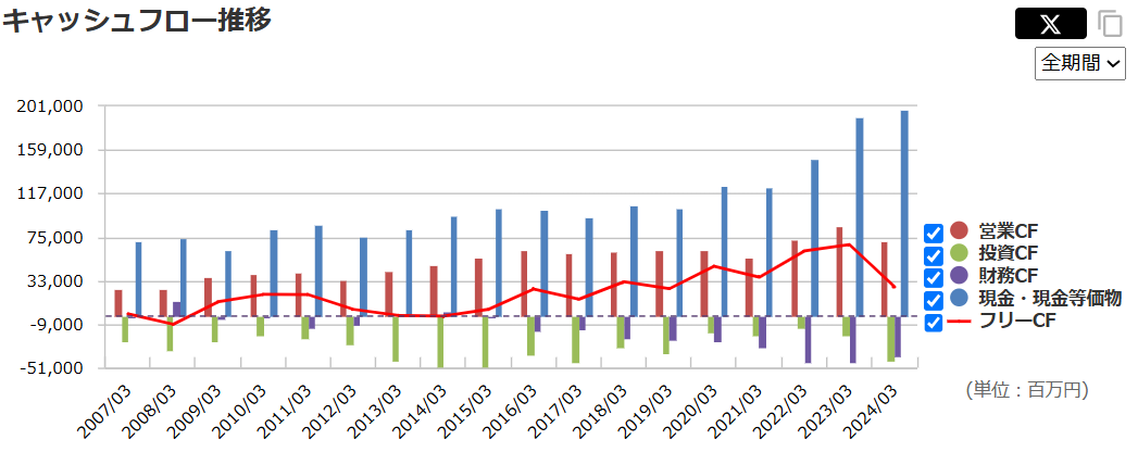 フリーキャッシュフローも安定的に確保できており、配当の原資も十分にあります。近年は設備投資を積極的に行っているため一時的にフリーキャッシュフローは減少していますが、これは将来の成長に向けた投資と捉えることができます.