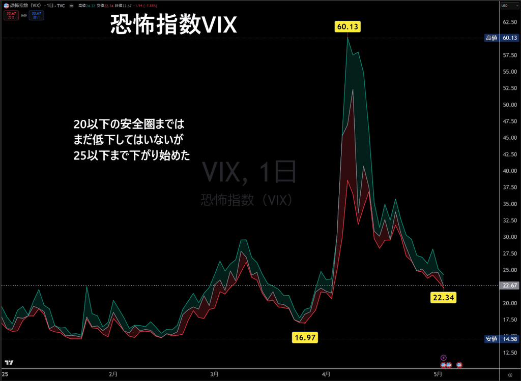 VIX(恐怖指数)は依然として注視される水準にあるものの、60を超えた直後から徐々に下落し、25前後で推移していた水準を割り込みつつあります。リスク回避姿勢の後退を示唆する兆候と見られます。