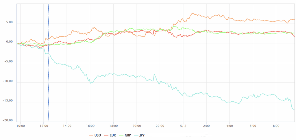 通貨の相対的な強さを比較した「通貨強弱チャート」を見ると、発表後24時間で円の売り圧力が顕著であり、ドル・ユーロ・ポンドはいずれも限定的な上昇にとどまっています。この流れから、円が主導する形での円安トレンドが再び勢いを増したことが読み取れます。