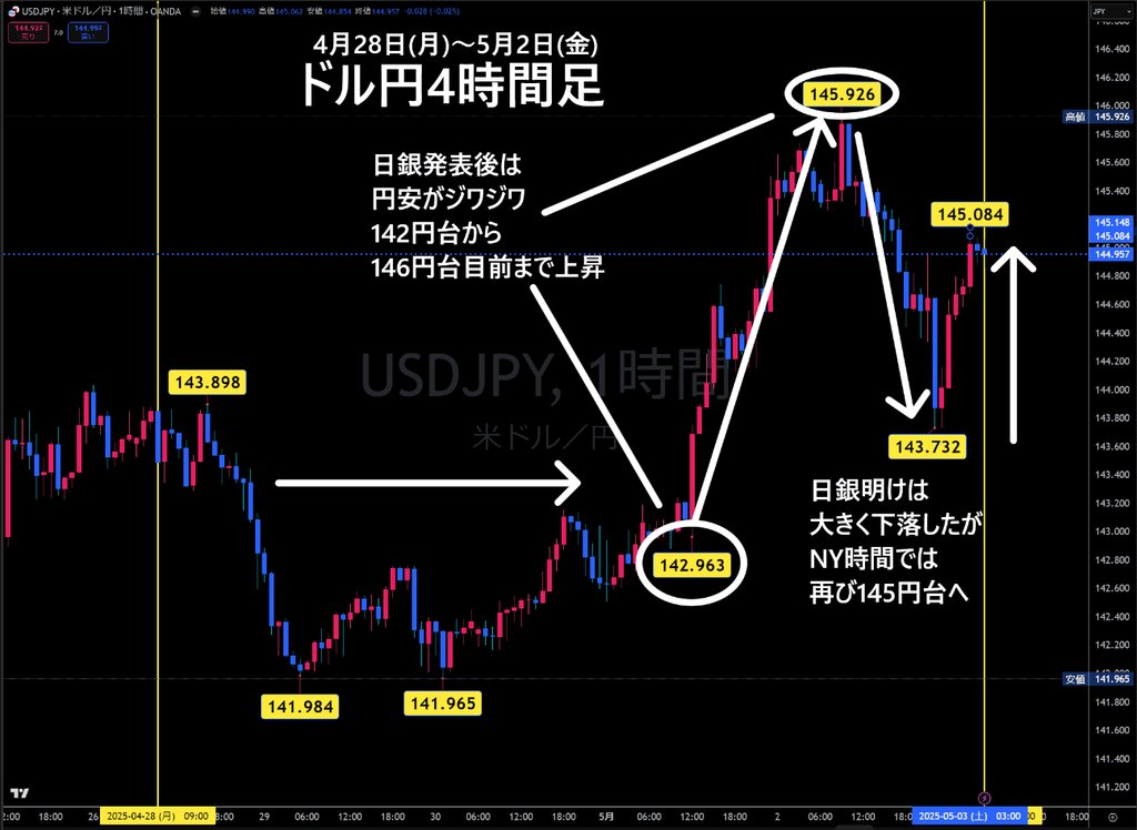 ドル円の4時間足チャートによると、発表当日は142.96円台から145.90円台まで一気に上昇。その後、短期的に143.70円近辺まで円高に戻る動きが見られましたが、米雇用統計の発表後には再び145円台を回復して取引を終えています。