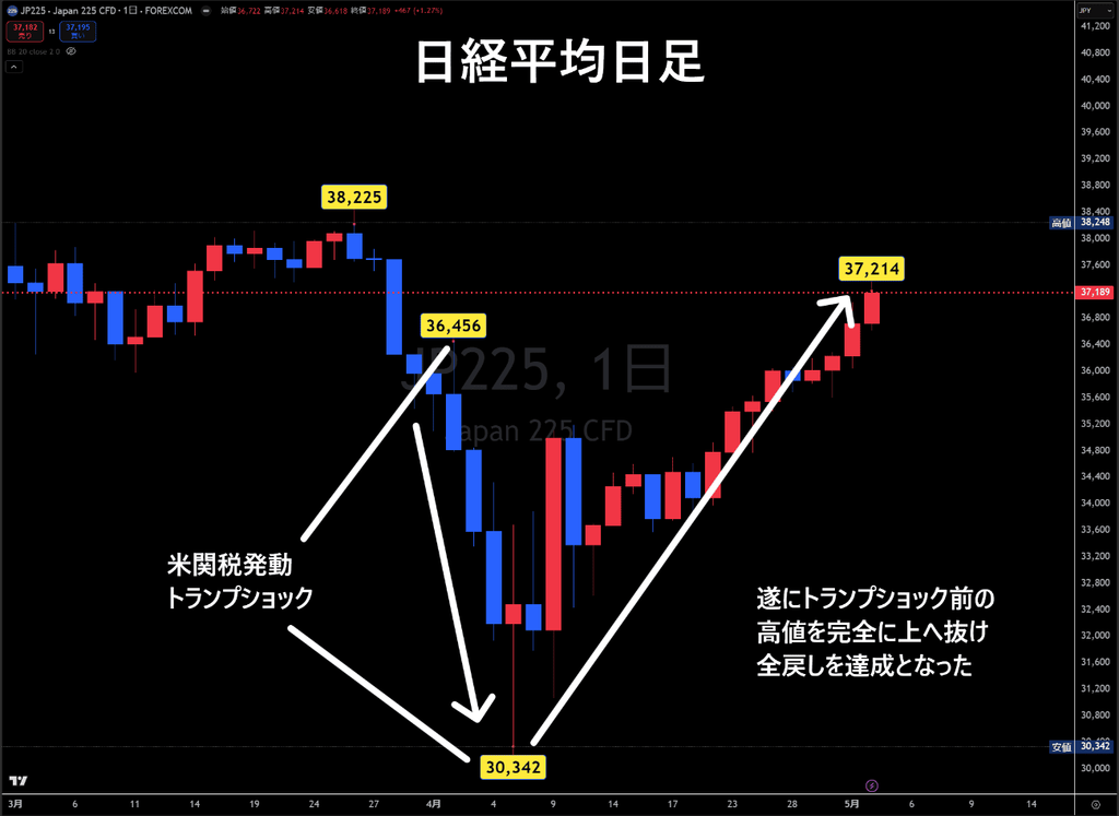 為替市場が乱高下する中で、日経平均株価は着実な上昇を見せており、「トランプショック」以前の水準を完全に回復したと見てよいでしょう。今後は38,000円台を突破し、大台達成に向けた動きが焦点となります。