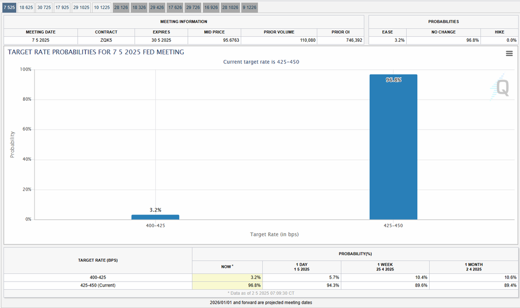 現時点では、「CME FedWatchツール」によると、政策金利は据え置きが96%の確率で予想されています。日本と同様、市場コンセンサス通りの決定が見込まれるものの、実際の声明文や会見内容を受けて相場が大きく動く可能性も想定されます。