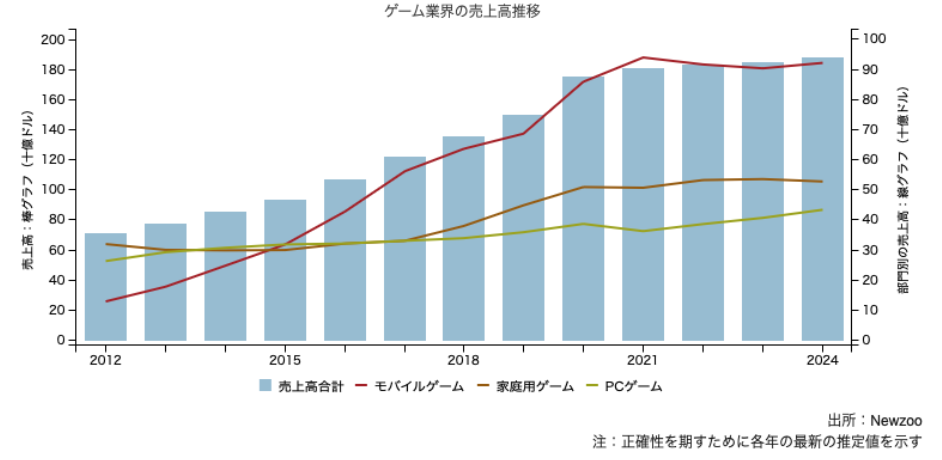 また、ゲーム市場全体の動向も無視できません。ゲーム業界全体の売上はモバイルゲームが大きく伸びており、家庭用ゲーム市場は任天堂の成功によって全体市場の大きさもある程度測られる側面があるものの、コロナ禍での爆発的な伸びが一服し、現在は安定あるいは微減傾向にあります。