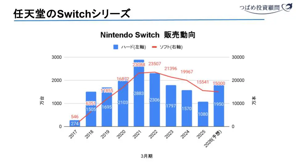 初年度の1,500万台から始まり、その後数年間は右肩上がりに販売台数を伸ばしました。特に2021年度には2,800万台以上という驚異的な販売を記録していますが、これはコロナ禍によって多くの人が自宅で過ごす時間が増え、ゲーム機の需要が高まったことが大きな要因です。コロナ禍のピークを過ぎた現在は、販売台数は減少傾向にあります。