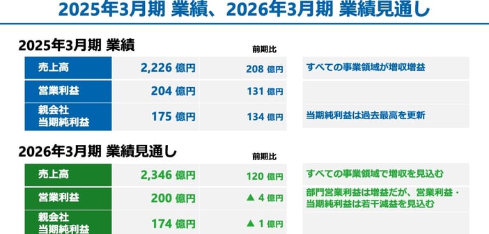 まず2025年3月期の業績です。売上高2,226億円、営業利益204億円、親会社当期純利益175億円でした。すべての事業領域で増収増益を達成することができました。また、当期純利益は過去最高を更新することができました。
