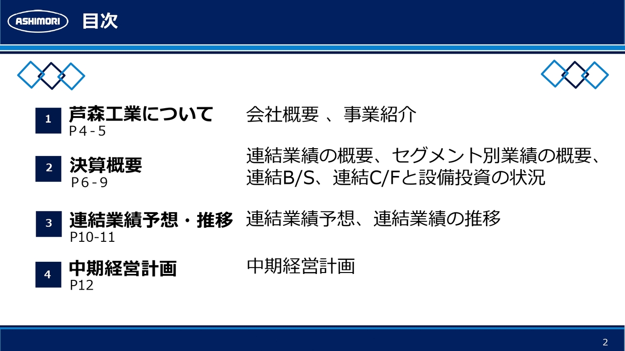 財津裕真氏:芦森工業株式会社取締役社長の財津です。どうぞよろしくお願いします。当社の概要、2025年3月期の決算についてご説明します。