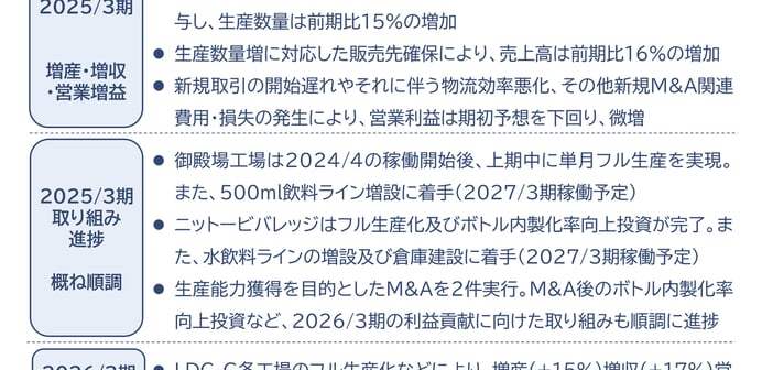 また、ニットービバレッジは投資第2弾となるボトル内製化向上の工事が完了したことに加えて、2025年4月より土日フル生産を開始するなど、順調に進捗しています。
