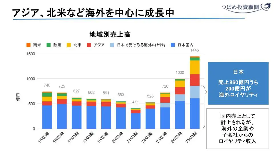 これは、国内売上として計上されている中に、海外の企業や子会社からのロイヤリティ収入が多く含まれているためです。日本の売上も伸びてはいますが、グラフの青色の部分(日本)だけを見ると、海外の伸び(水色部分)が圧倒的であることが分かります。