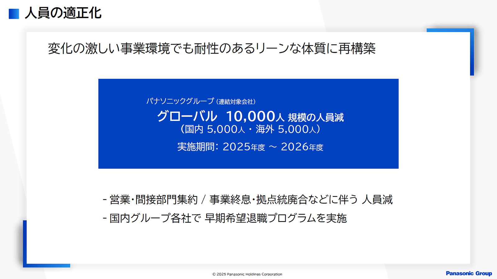 パナソニックが発表したグループ経営改革の中で、「人員の適正化」という項目が設けられています。これは、生産性を高めるために、1万人規模の人員整理を行うという内容です。