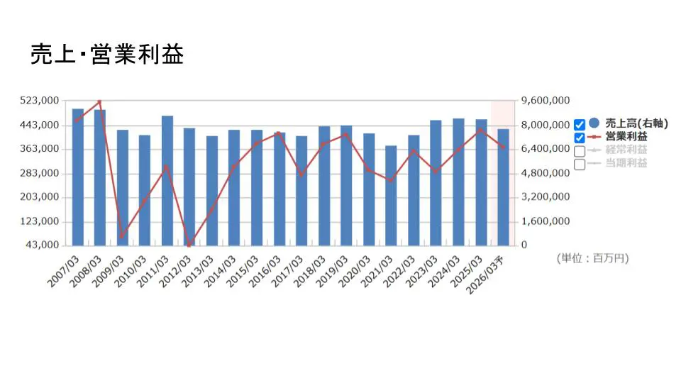 パナソニックの業績推移を見ると、利益は赤字ではないものの、長年にわたって業績があまり伸びていない状態が続いています。アップダウンを繰り返しながらも、全体としては横ばいの状態と言えます。