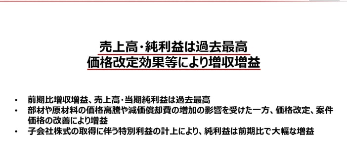 トピックスです。部材価格高騰の影響と価格改定効果は、ほぼ想定どおりの結果となりました。一方、案件価格の変化については、企業の設備投資需要の堅調さを背景に、売上が増加したことに伴い、想定を上回る増益効果となりました。