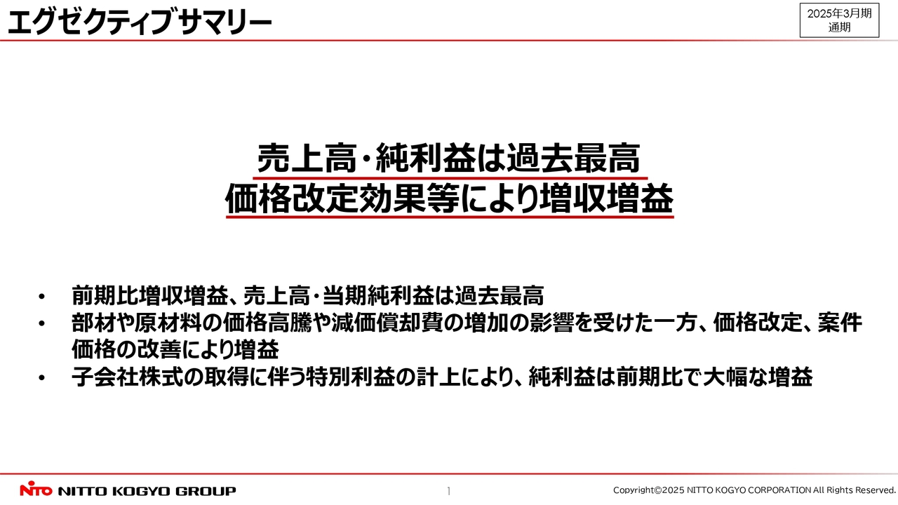 はじめにエグゼクティブサマリーです。2025年3月期の通期連結売上高・当期純利益は過去最高となりました。部材や原材料の価格高騰や瀬戸工場稼働に伴う減価償却費の増加の影響を受けた一方、価格改定効果や案件価格の改善に伴い、増益となりました。また、子会社株式の取得に伴う特別利益の計上などにより、当期純利益は前期比で大幅な増益となっています。
