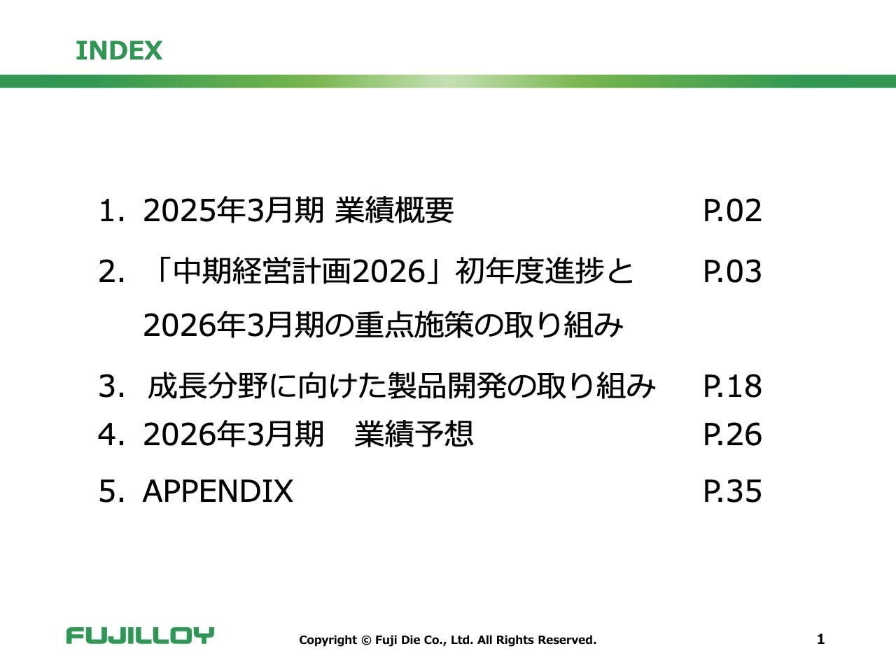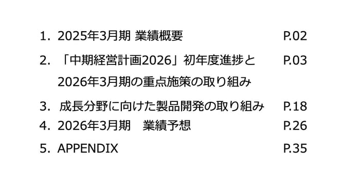 今回の決算説明会では、2025年3月期の業績概要、「中期経営計画2026」の初年度進捗と2026年3月期の重点施策の取り組み、成長分野に向けた製品開発の取り組み、2026年3月期の業績見通しを中心にご説明します。