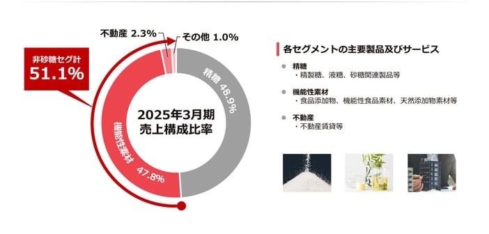 事業内容についてご説明します。2025年3月期の連結売上高構成比率は、精糖事業が48.9パーセント、機能性素材事業が47.8パーセントとなっており、この2つの事業が当社の両輪です。非精糖事業が売上構成の50パーセント以上まで成長しました。引き続きフードサイエンスカンパニーを目指して非精糖事業を推進していきます。