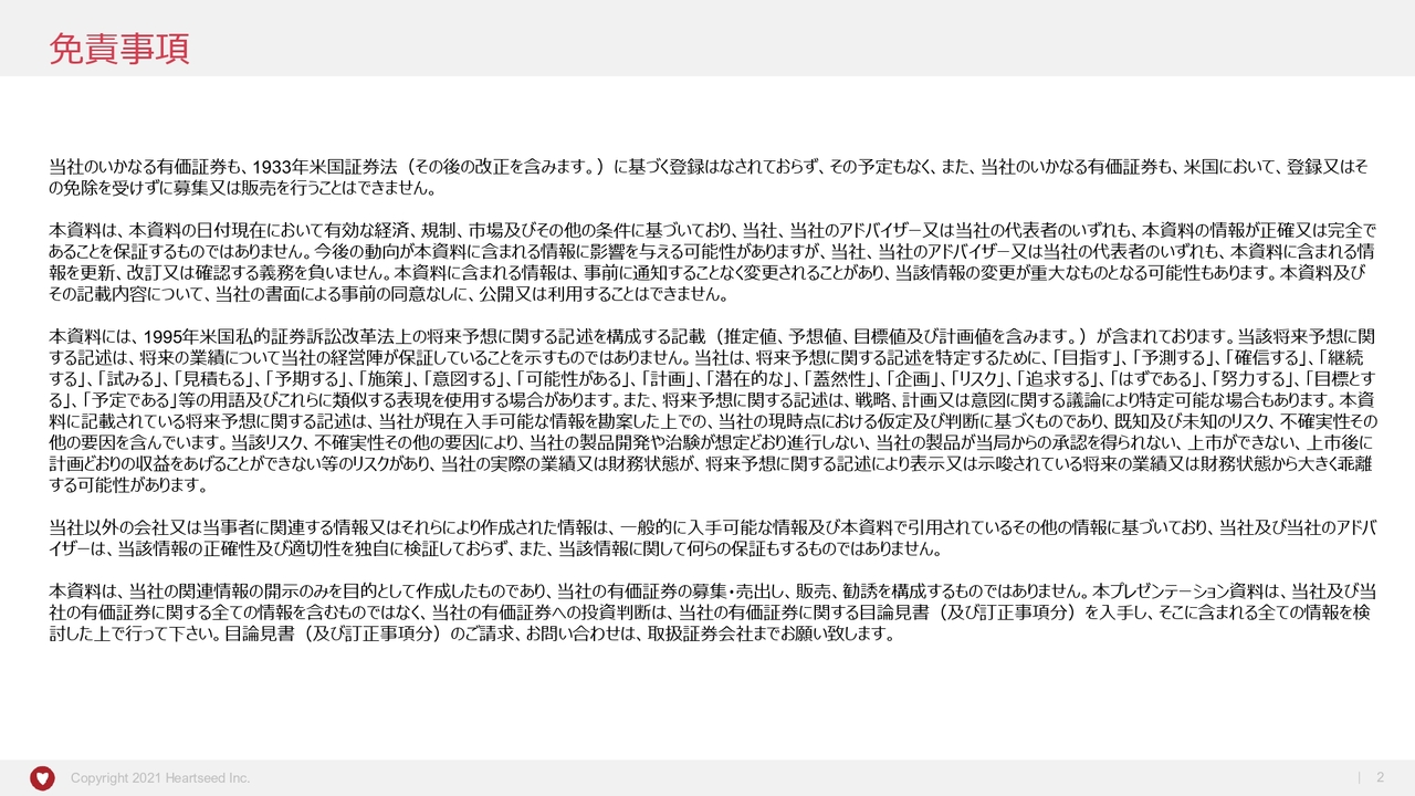 また、アセットライトな経営のもと、有利子負債もなく、高い健全性を維持しています。今後加速します、「HS-001」の承認や上市に向けた準備、また「HS-005」の開発に向けて、しっかりとアクセルを踏める財務状況であると考えています。