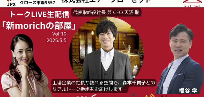 2025年3月5日に実施された、「新morichの部屋 Vol.19 株式会社エアークローゼット 代表取締役社長 兼 CEO 天沼聰さん」の内容を書き起こしでお伝えします。