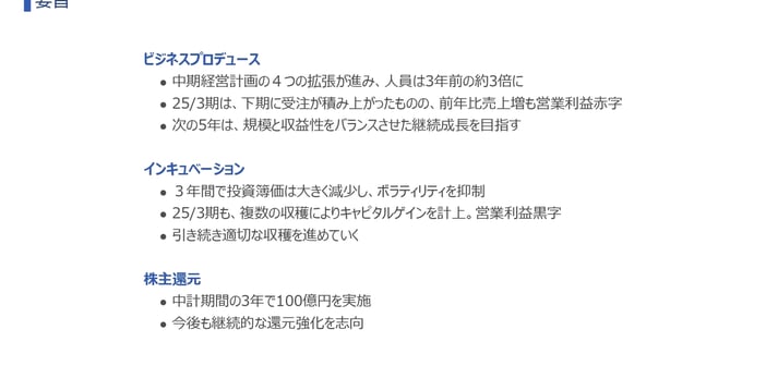 中期経営計画の振り返りです。2023年3月期から2025年3月期の中期経営計画では、構造改革期と位置付けて、ビジネスプロデュースの拡大と、インキュベーションの収束を推進してきました。