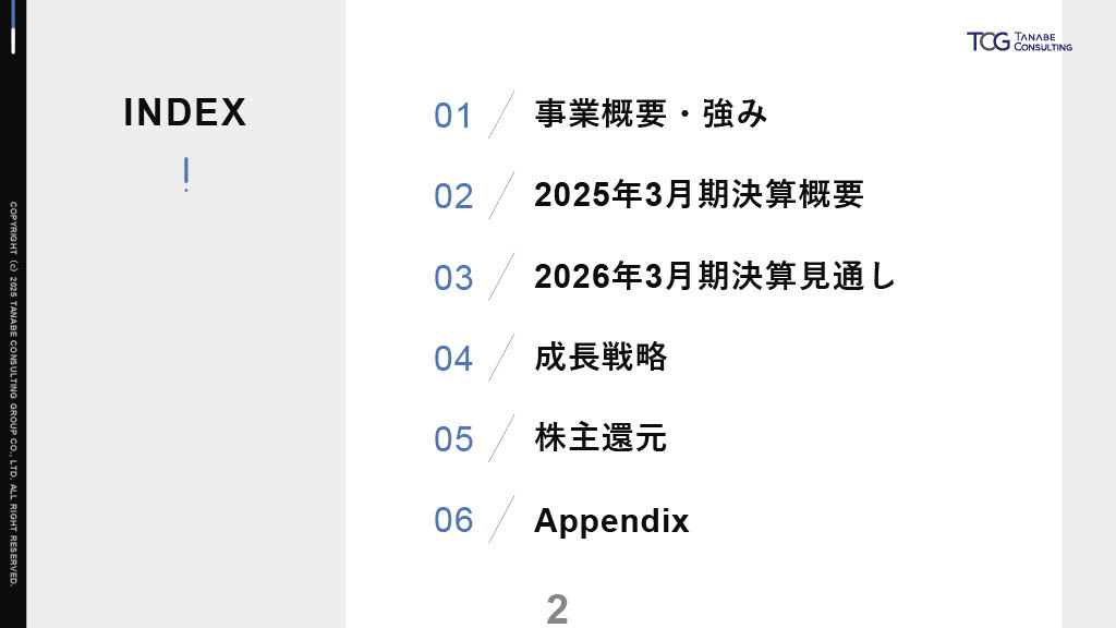 若松孝彦氏(以下、若松):みなさま、こんにちは。タナベコンサルティンググループ(以下、TCG)代表取締役社長の若松孝彦です。本日は、当社の2025年3月期の決算説明会をご視聴いただき、誠にありがとうございます。