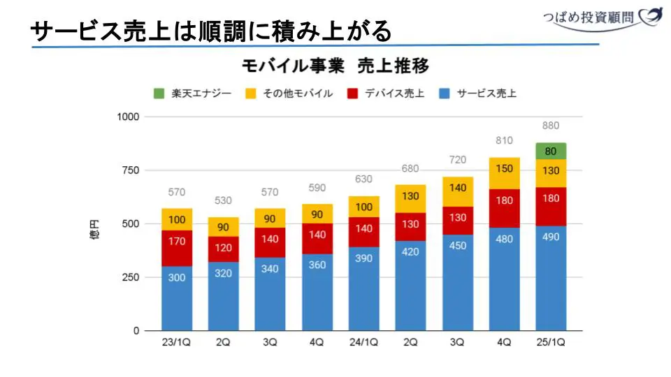 一方で、会計上の見せ方はさておき、冷静にデータを見ると、楽天モバイルの売上自体は着実に伸びてきています。月々の通信料を指すサービス売上やデバイス売上に加え、今期からは楽天エナジーを吸収合併したことにより、売上に貢献しています。