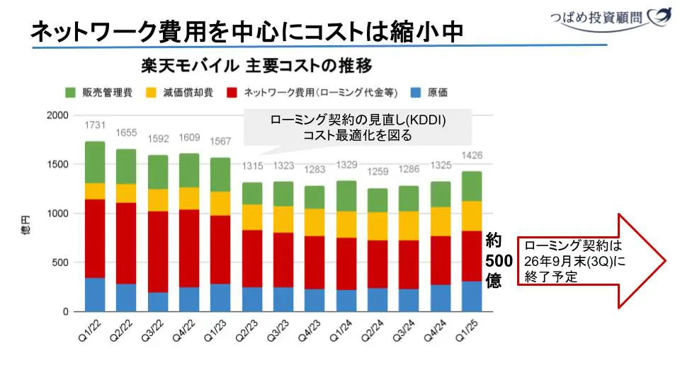 現在のネットワーク費用は全体の約500億円を占めていますが、KDDIとのローミング契約は2026年9月末に終了予定とされており、今後さらにネットワーク費用が減少する可能性があります。ただし、楽天独自のネットワークが十分でない場合、契約の再延長の可能性も考えられます。