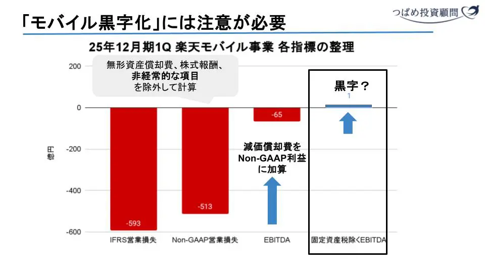 このEBITDAでさえ、楽天モバイルは65億円の赤字でした。そして、そこからさらに「固定資産税」を除外するという、前例のない手法を用いることで、ようやく1億円の黒字を「ひねり出した」というのが実態です。固定資産税はキャッシュが確実に出ていく費用であり、これを除外することには合理性が乏しいと言えるでしょう。