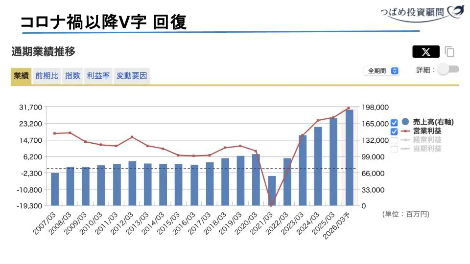 しかし、コロナ禍での臨時休業や営業停止を経て一時的に赤字に転落したものの、そこからの回復は目覚ましく、売上を大きく伸ばし、営業利益も過去最高を更新し続けています。特に、2023年、2024年、2025年、2026年と非常に順調に成長を続けているのが特徴です。