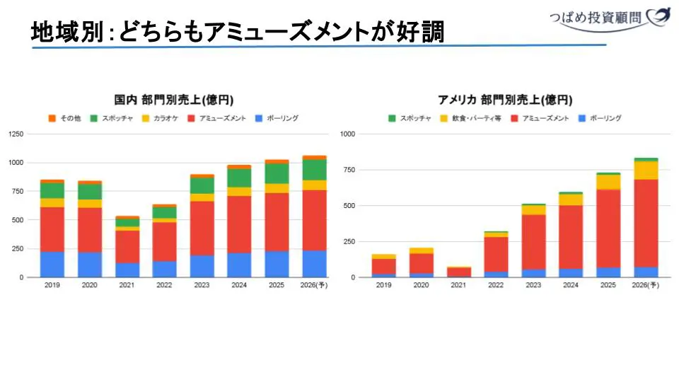 国内とアメリカの事業別売上構成を見ると、共通してアミューズメント部門(UFOキャッチャーやゲームセンター関連)が非常に大きく伸びています。