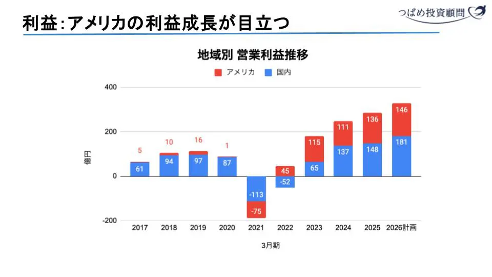 利益面でもアメリカの成長は顕著です。2017年には約5億円だったアメリカの利益が、2025年には136億円にまで伸びています。日本も倍以上に伸びてはいますが、成長率で考えるとアメリカが牽引役となっていると言えるでしょう。