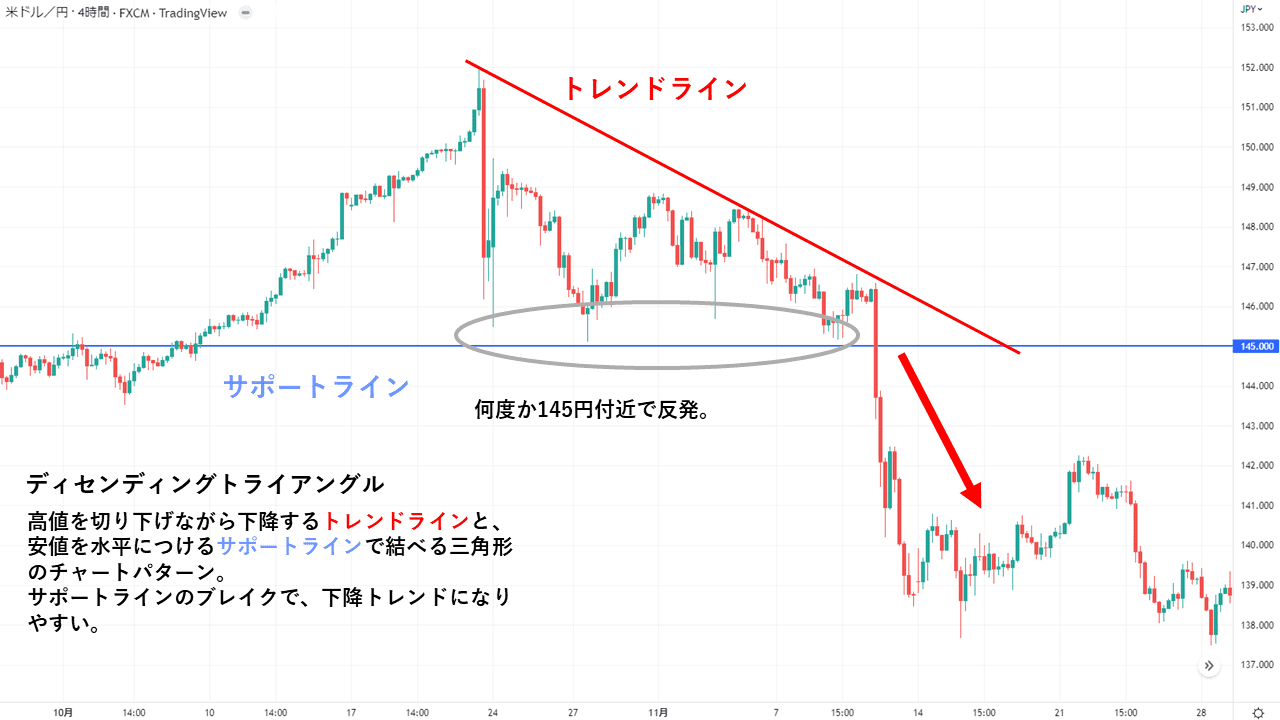 例えば、現在(2022年11月10日時点)のドル円を見てみると、145円付近をサポートラインにして跳ね返しつつ、高値も切り下げてきている状況です。セオリーでいえば、これはディセンディングトライアングルという形で、下の方に抜けやすいです。