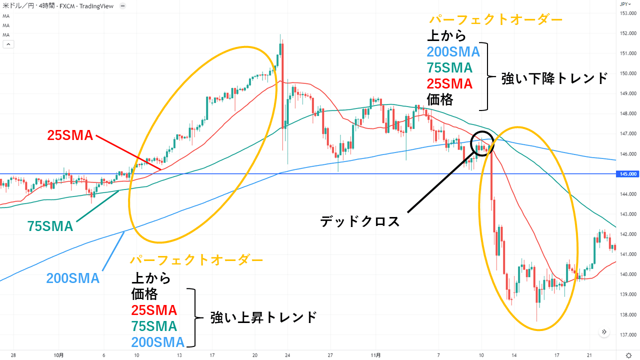 他には、単純移動平均線(SMA)を使うのも良いと思います。僕は25、75、200や300で期間を表示していて、これも王道の設定ですね。チャートパターンに加えて、デッドクロスなどが出ると噛み合います。特に価格が移動平均線の上下どちらで推移しているのかを確認した上でのトレンドフォローと、抜けた後に何かしらのデッドクロスやゴールデンクロスが確認できているかに注目して見ると良いと思います。