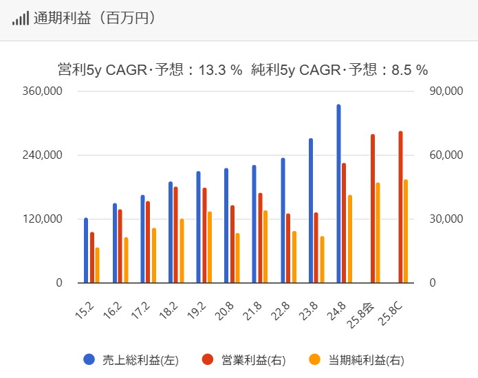 業績を見ると、営業利益は株価上昇期(2018〜2019年頃)に拡大していましたが、その後は大きく落ち込みます。