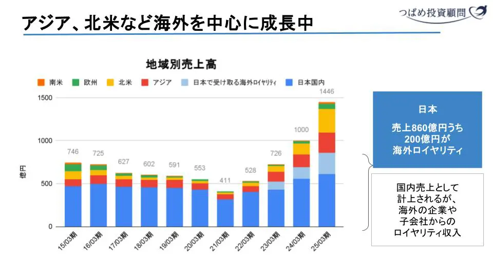 サンリオの売上を地域別に見ると、青色の日本も伸びてはいますが、それ以上に黄色の北米が大きく成長していることが分かります。決算資料では日本の売上比率が高く見えますが、その中に海外ロイヤリティが含まれており、実質的には海外売上比率が50%を超えていると見られています。中国や韓国を含むアジア地域でも、現地のゲームとのコラボレーションなどによりIP発信を強化し、成功を収めています。