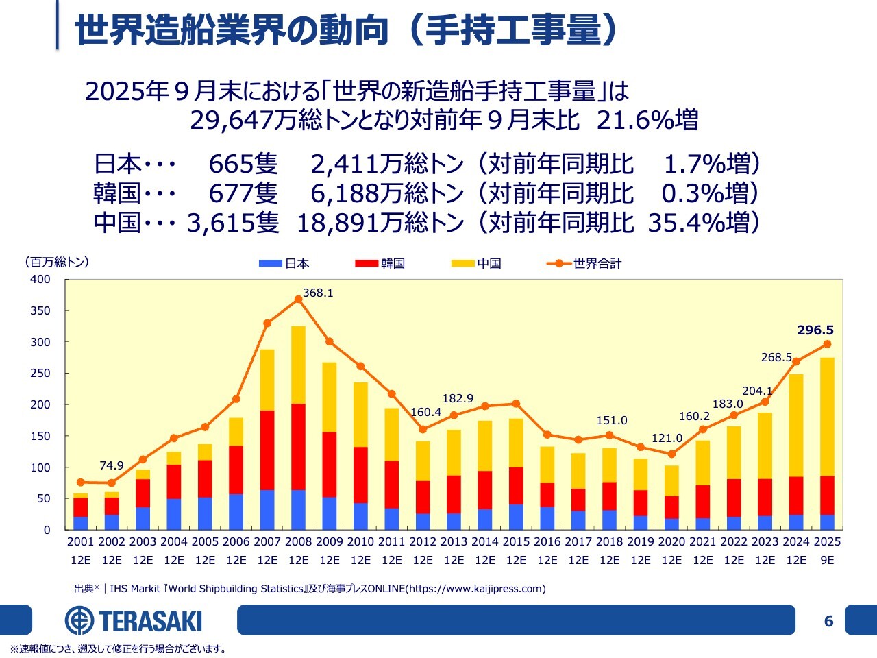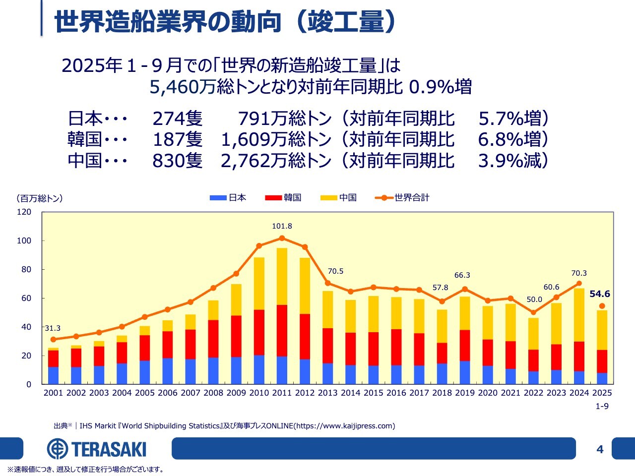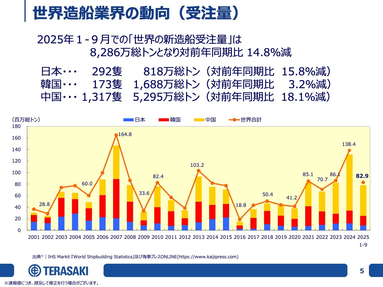 ちなみに、スライドのグラフは2001年、すなわち今世紀に入ってからのデータを示しています。2010年、2011年、2012年は前回の造船ブームがあった時期で、その後の約十数年は5,000万総トンから7,000万総トンの範囲で推移し、2022年には5,000万総トンとなりました。これが底であったと考えられます。そして2023年、2024年、2025年と、わずかではありますが増加しています。