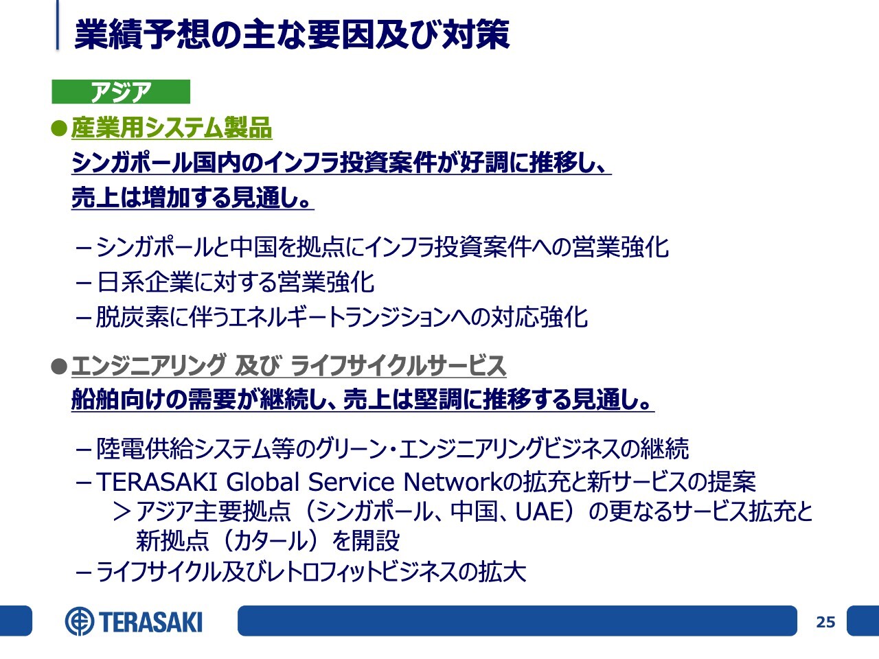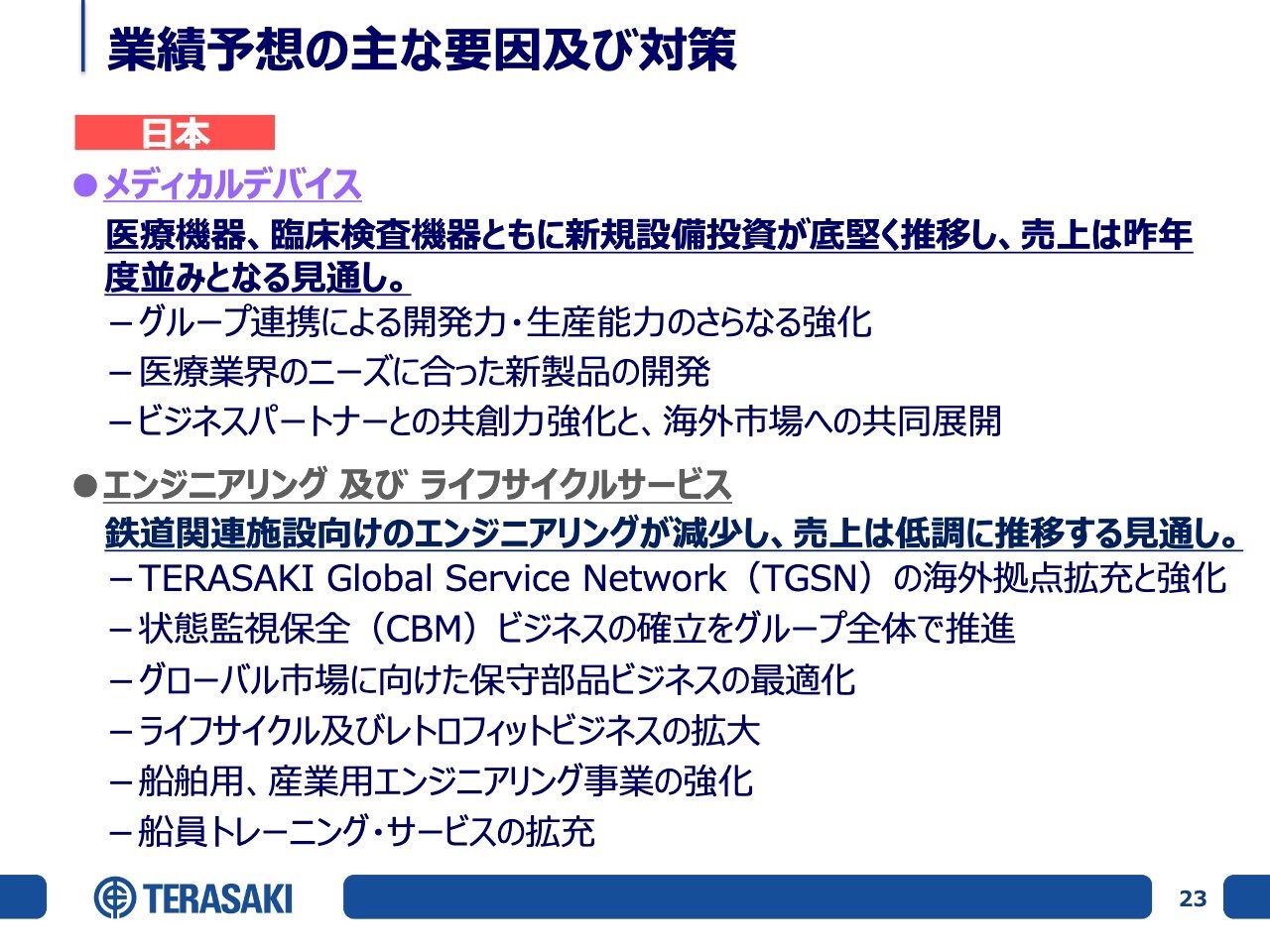 エンジニアリング及びライフサイクルサービスについてです。TERASAKI Global Service Networkの人材を増やしており、ヨーロッパ地域でも人員を拡充しています。特に欧州・中近東での拠点の拡充を通じて、お客さまのニーズに応える対応力を強化していきます。また、ライフサイクルサービス事業の拡大に向けて、このヨーロッパ地域にもさらに力を入れていく予定です。