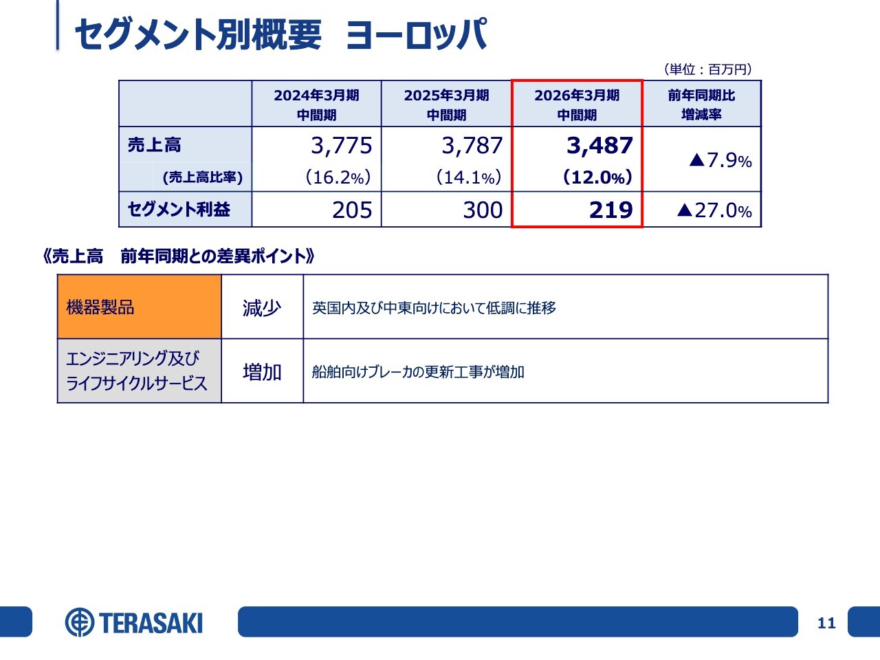 ヨーロッパの売上高は前年同期比7.9パーセント減の34億8,700万円、セグメント利益は前年同期比27.0パーセント減の2億1,900万円でした。