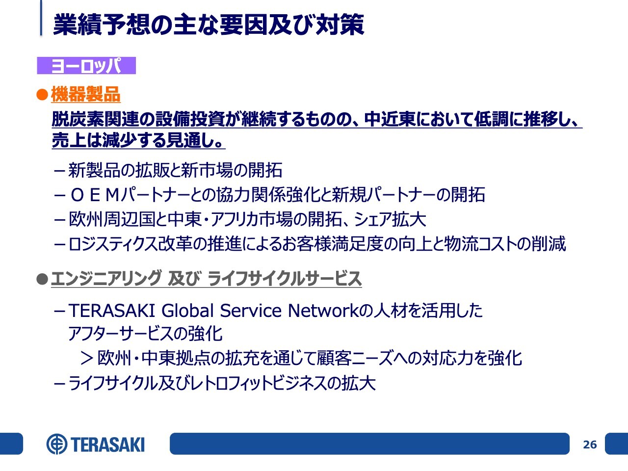 ヨーロッパについてです。機器製品では、脱炭素関連の設備投資は継続しているものの、中東で若干低調に推移しており、前期よりも減少する見通しとなっています。そのため、今期は新製品の拡販に注力し、特に来期から販売予定の新しい製品群の準備を進めています。