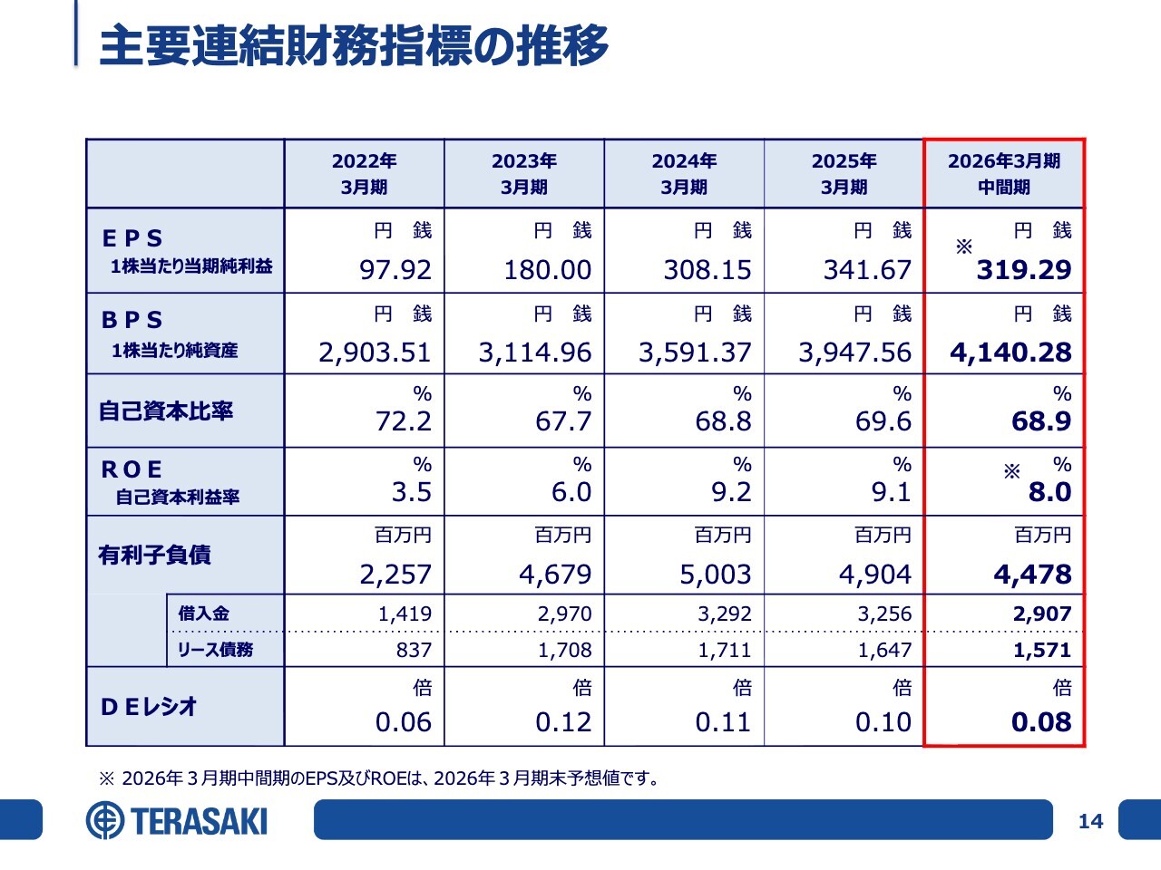 主要な連結財務指標の推移についてです。EPSは2026年3月期末の予想値を用いて算出しており、319円29銭と、前年同期比で減少する見込みです。BPSは4,140円28銭で、前期末比より増加しました。