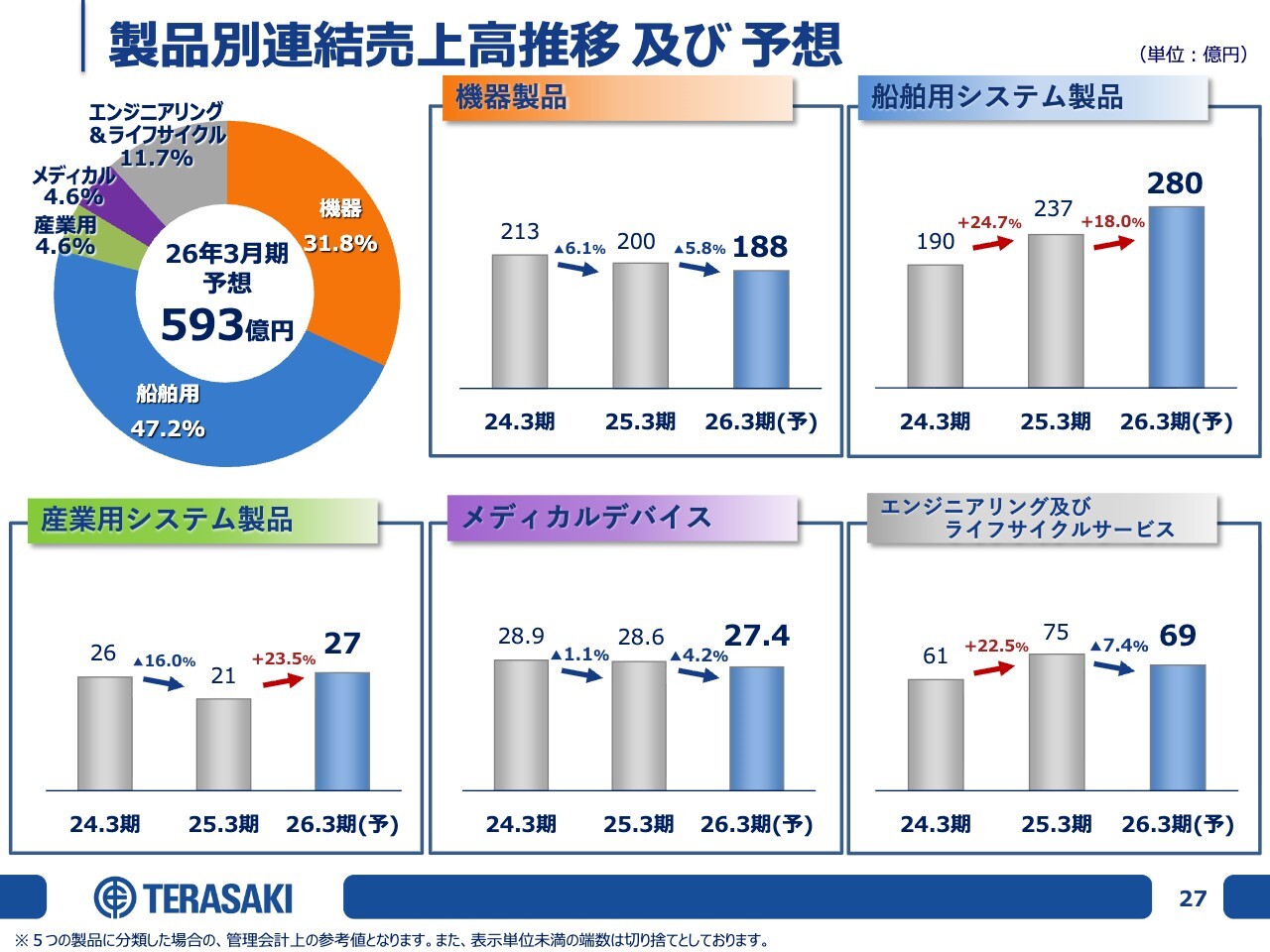 このうち、機器(ブレーカ)製品は188億円で前年同期比約6パーセント減、船舶用システム製品は280億円で前年同期比18.0パーセント増、産業用システム製品は27億円で前年同期比23.5パーセント増、メディカルデバイスは27億4,000万円で前年同期比若干のマイナス、エンジニアリング及びライフサイクルサービスは69億円で前年同期比7.4パーセント減という予想となっています。