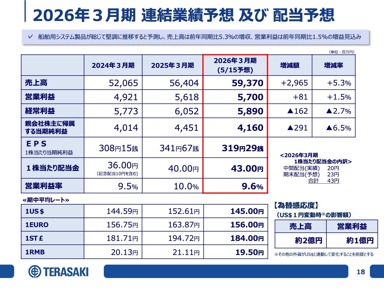 2026年3月期の連結業績予想及び配当予想についてです。船舶用システム製品が総じて堅調に推移すると予測し、売上高は前年同期比5.3パーセント増、営業利益は前年同期比1.5パーセントの増益を見込んでおり、期初の予想から変更していません。