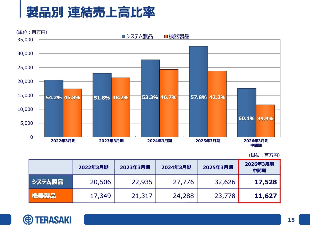 スライドは、当社製品売上高をシステム製品と機器製品に大別した比率です。2026年3月期中間期はシステム製品が175億2,800万円、機器製品が116億2,700万円となり、システム製品の比率が高まっています。