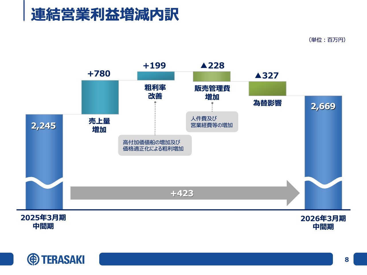 連結営業利益の増減内訳についてです。売上量の増加により7億8,000万円のプラス効果がありました。また、高付加価値船の増加や価格の適正化を目指した努力の成果によって粗利率が改善し、約2億円のプラス効果がありました。