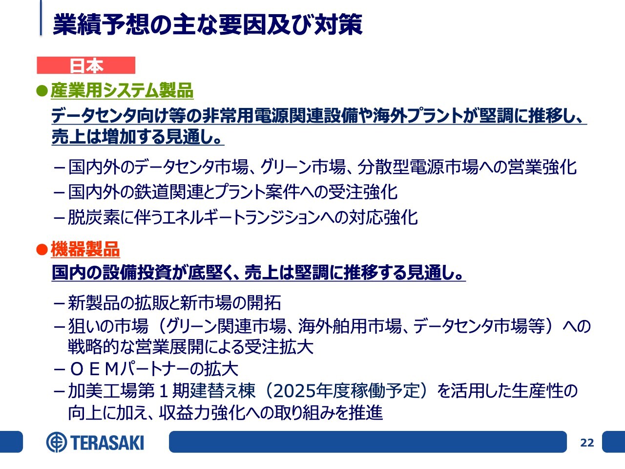 機器製品のうち、ブレーカに関しては国内の設備投資が底堅く推移しており、売上が堅調に推移する見通しです。一方、国内の設備投資は堅調でありながらも、人手不足やサプライチェーンの問題により、納期が遅れる状況が続いています。このため、見通しを立てにくい状況が続いています。
