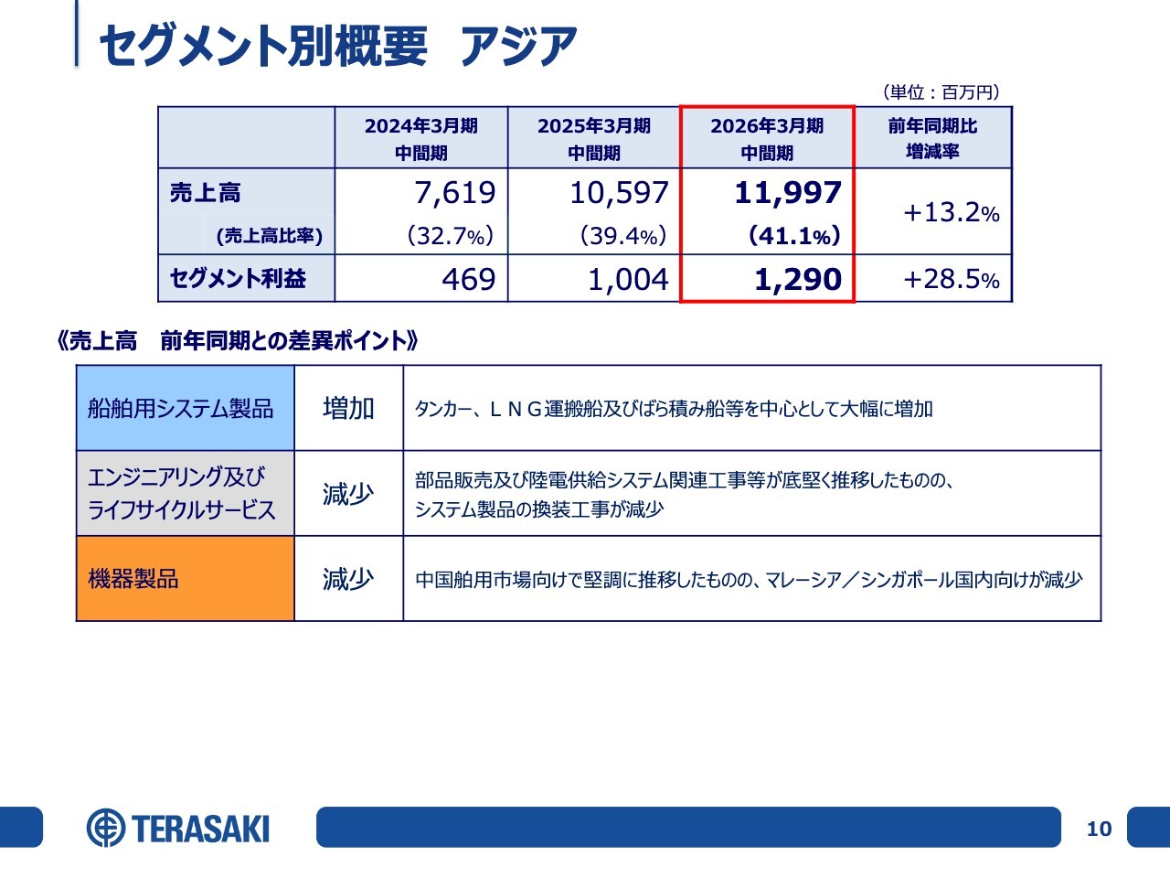 アジアには中国や韓国が含まれており、船舶用システム製品の売上高が増加しました。タンカーやLNG運搬船、ばら積み船等、すべての船種で増加しました。一方、エンジニアリング及びライフサイクルサービス、機器製品については若干減少しました。